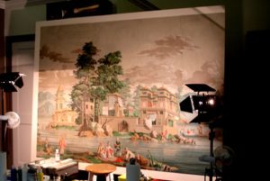 Here is a look at what I am doing this week in Washington DC. This is an 18th century wallpaper made with woodblock prints . It would have been manufactured by a company like Joseph Dufour et Cie. I’m working with Page Conservation who have mounted the wallpaper on panels and I am very carefully filling in paint losses with my coworker Dana Sax-Ruud.