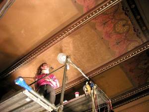 The building was extensively decorated but unfortunately was over-painted in the late 1940’s. In the photos you can see the room and ceiling frescoes that we are currently restoring, as well as some of my co-workers.