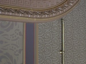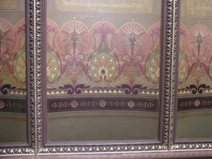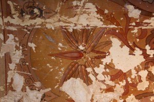 About the 1940’s the decorations in a whole series of rooms were painted over and by the time we got to them there were about ten coats of paint on them. So basically the process starts by carefully removing the over-paint while trying to save the original layer. Next, the remaining original mural paint is conserved and stabilized with glue and other materials. Then we re-paint the missing areas in, trying to conserve as much of the original paint as possible. We use reversible materials so our work can always be removed.