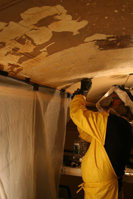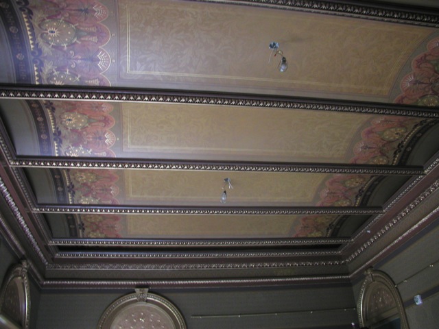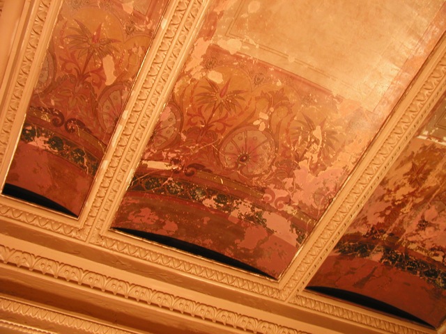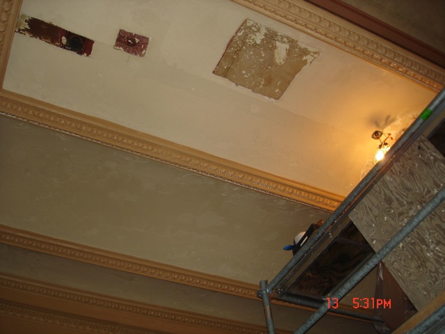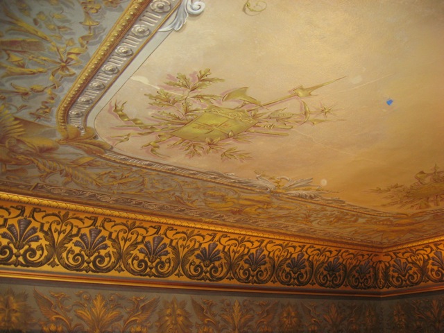 in the following gallery which includes several rooms, you can see the beginning stages (where the ceilings are white), intermediate stages, and the completed stages where the original murals look, well, original! Keep in mind everything you see had been completely painted over.