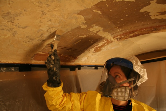 About the 1940’s the decorations in a whole series of rooms were painted over and by the time we got to them there were about ten coats of paint on them. So basically the process starts by carefully removing the over-paint while trying to save the original layer. Next, the remaining original mural paint is conserved and stabilized with glue and other materials. Then we re-paint the missing areas in, trying to conserve as much of the original paint as possible. We use reversible materials so our work can always be removed.