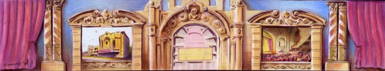 My mural would have feature painted versions of the architectural details of the façade and interior of the theater. Two insets would have been painted within these architectural elements. One was planned to show a complete view of the exterior of the theater building on Sheridan Road, and the other a view of the interior of the theater. To the sides were painted theater curtains. A center written inset would have featured the history of the theater.