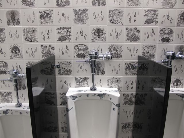 I visited the Smith College Museum of Art this fall.There were many great paintings and Northhampton, MA. is a terrific town. But the funnest part was their restrooms, which are beautifully decorated by two artists who did residencies at the Kohler plant in Wisconsin, Ellen Driscoll and Sandy Skoglund. Skoglund is responsible for the black tilework and Driscoll the blue.