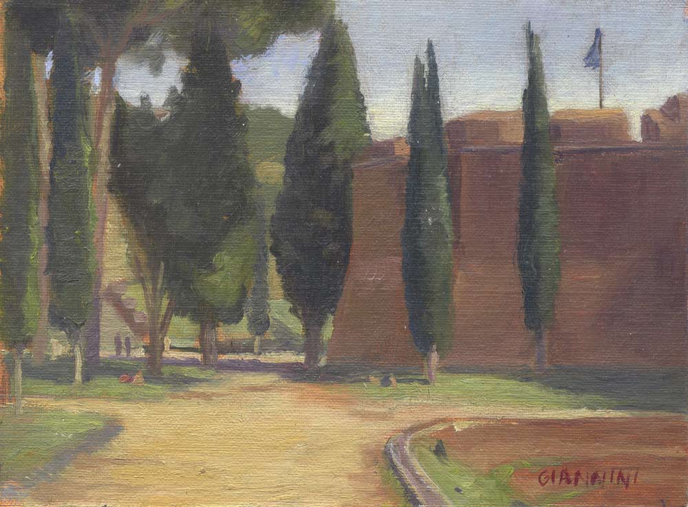 I did this landscape painting in a very pleasant little park behind The Mausoleum of Hadrian, usually known as Castel Sant’Angelo (English: Castle of the Holy Angel), which is a towering cylindrical building in Parco Adriano, Rome, Italy. It was initially commissioned by the Roman Emperor Hadrian as a mausoleum for himself and his family. The building was later used by the popes as a fortress and castle, and is now a museum. The Castel was once the tallest building in Rome.